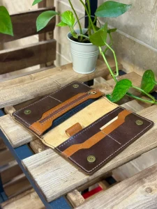 توضیحات محصول کیف پول چرمی دست‌دوز با جای موبایل: